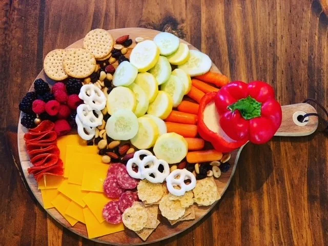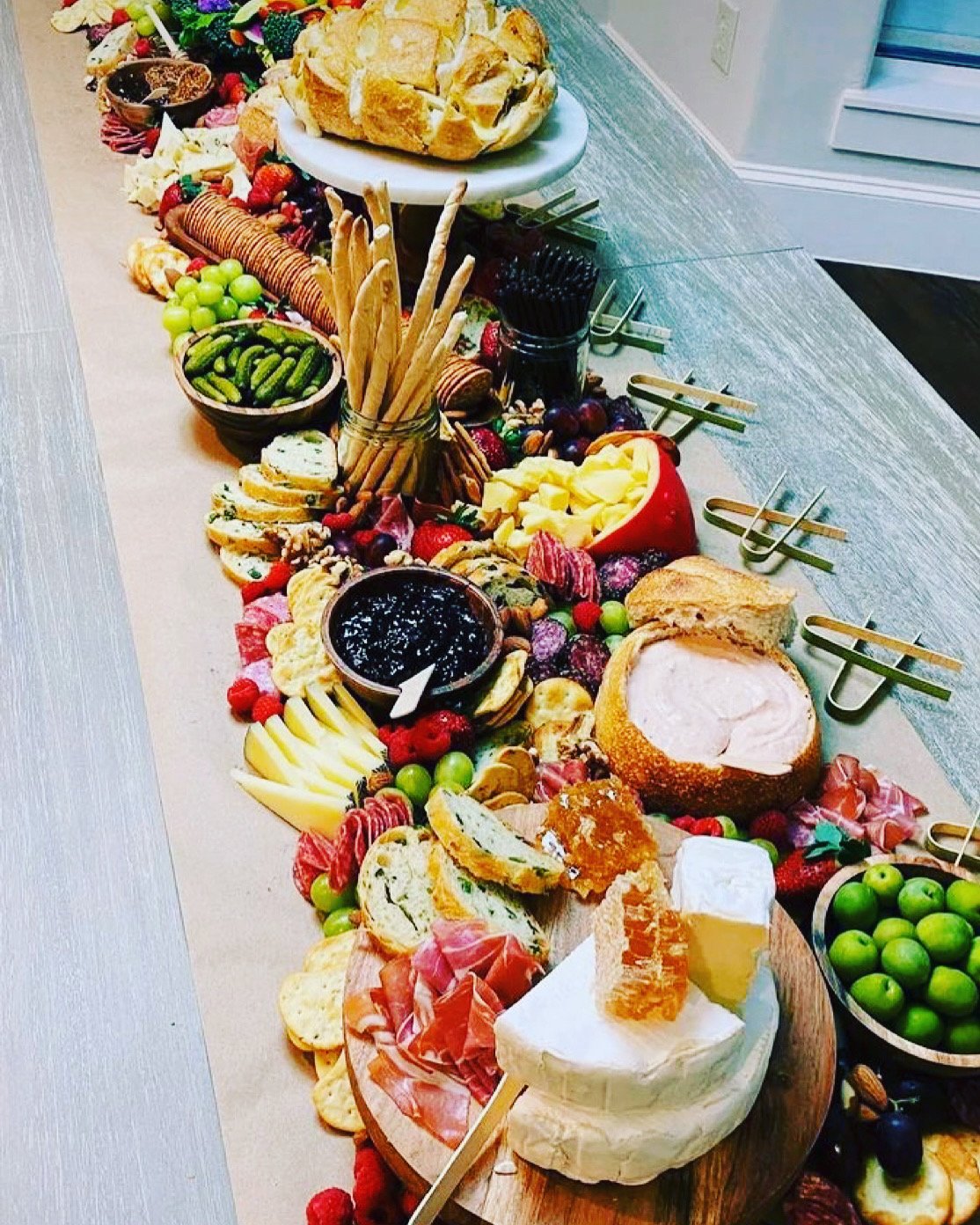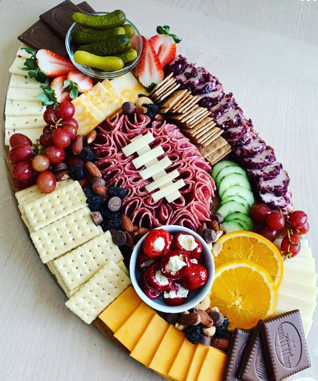 Extra Large Board 5 premium meats, 4 premium cheeses, local honey, bacon jam, spinach artichoke dip, seasonal fruit, vegetables, crackers 22"x12" Disposable Leaf Tray Serves up to 15 $235