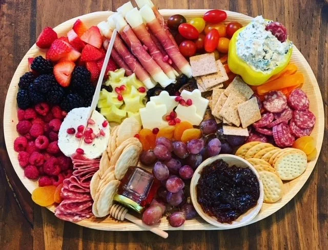 Large Board 4 premium cheeses, 3 premium meats, bacon jam, local honey, seasonal fruits, olives, nuts, crackers 17" x12"Disposable Leaf Tray Serves up to 10 $175